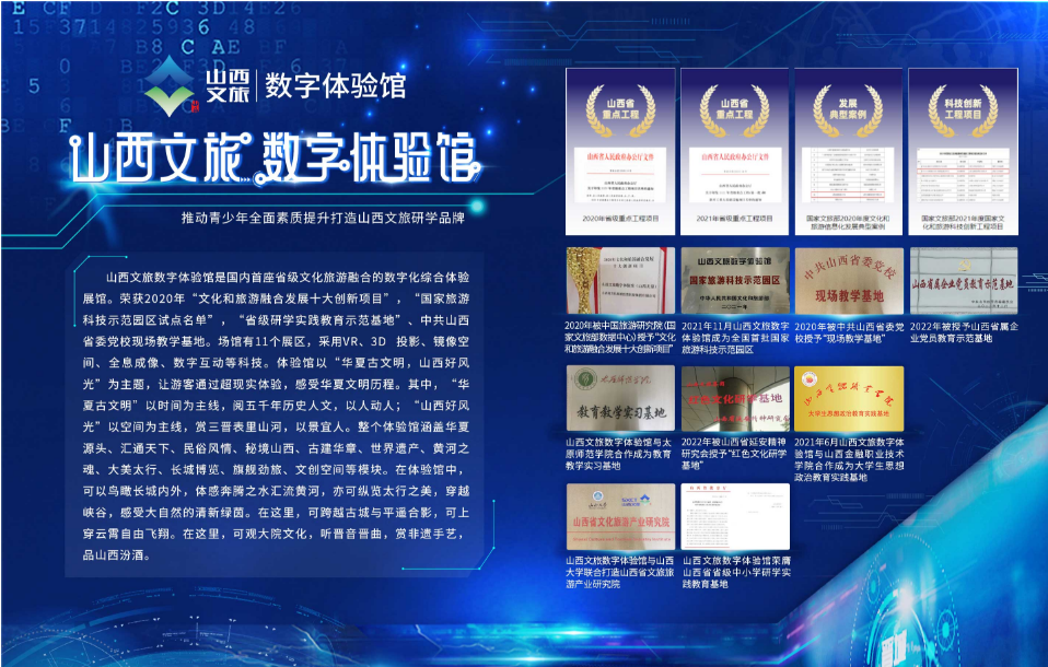 山西文旅数字体验馆,是由山西文旅集团统筹投建的国内首座省级文旅融合的数字展馆,2021年被国家文旅部评选为全国首批国家旅游科技示范园区之一,“2020年文化和旅游融合发展十大创新项目”。该馆以科技赋能文旅融合,以“华夏古文明,山西好风光”为主题,运用多种先进技术,打破历史、艺术、技术的界限再现、还原、展示华夏五千年文明,带你“发现”不一样的山西。